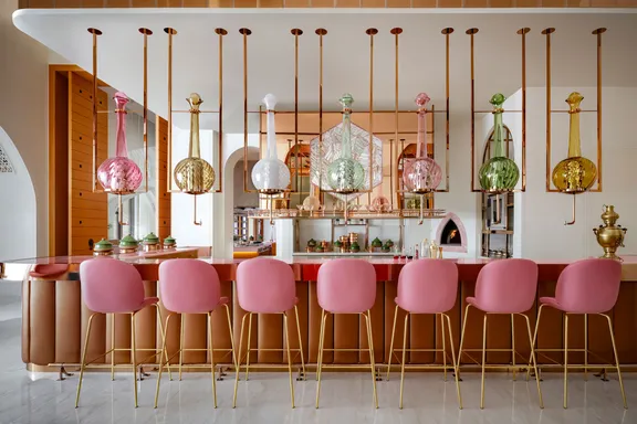 The interior is a love letter to pre-revolution Tehran: blush pink banquettes, hand-carved timber screens, silver samovars glinting on copper counters, and a floor plan calibrated so that the open charcoal grill becomes the theatre. Persian tiled mirrors scatter candlelight like something out of a Shah-era tea house. It is, in the best possible sense, a setting that knows exactly how special it is.